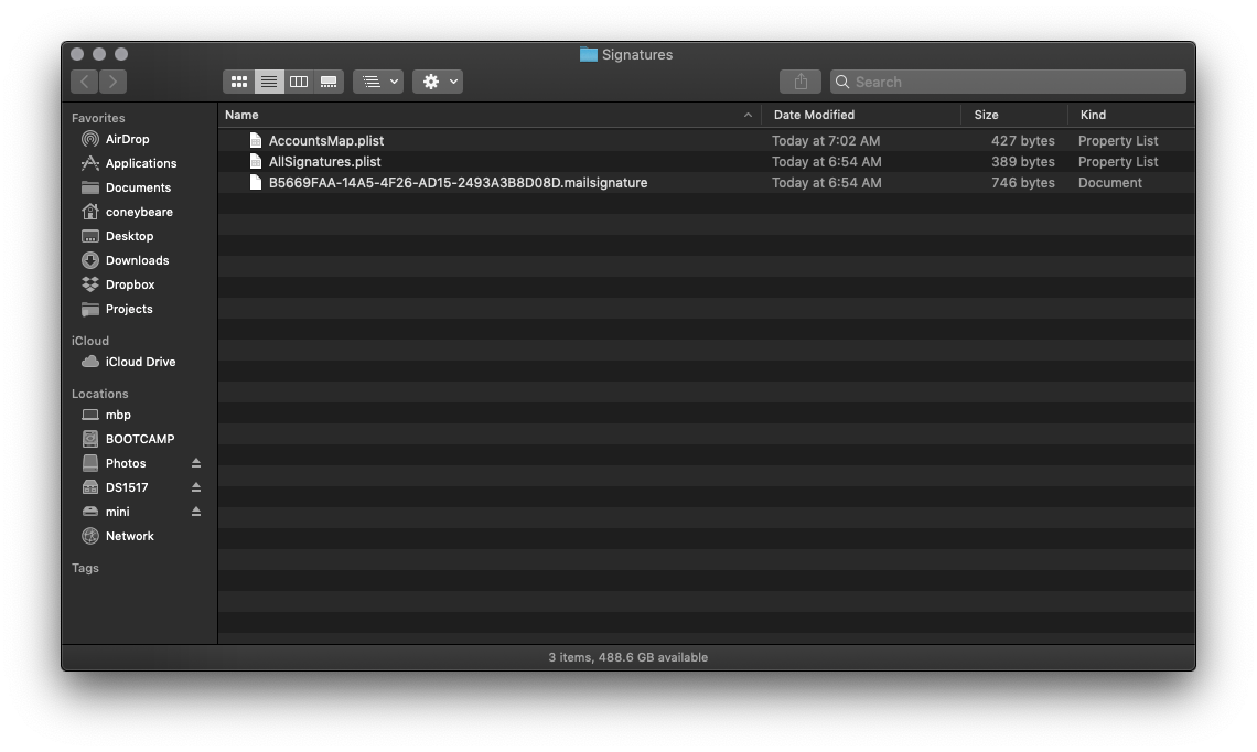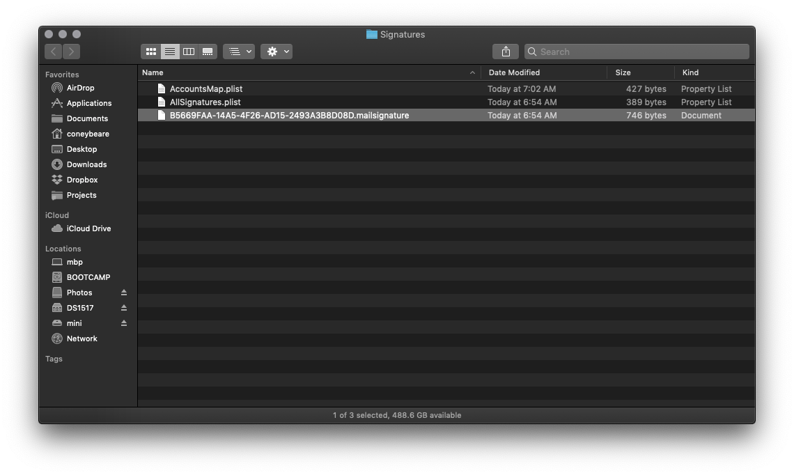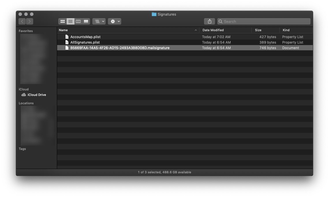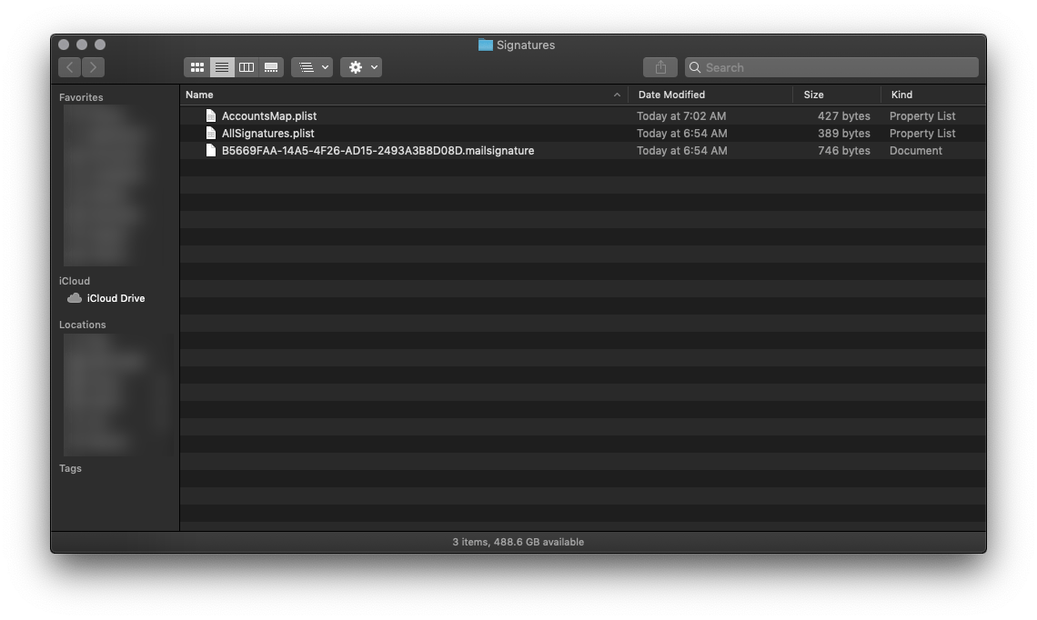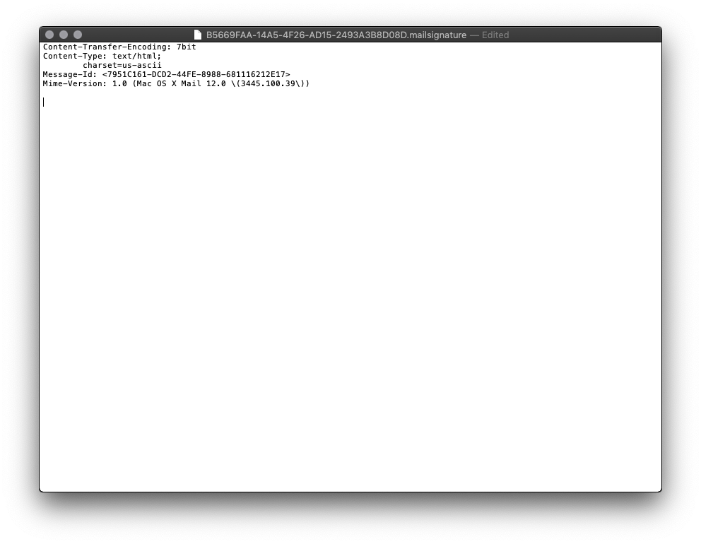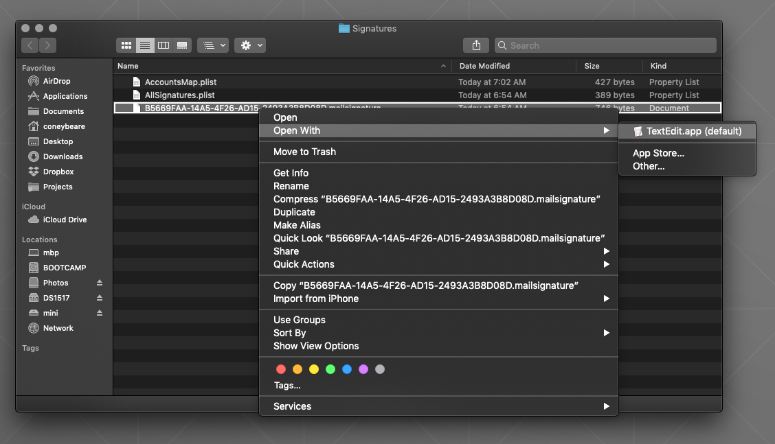 As mentioned above, we could normally use Finder to view these folders, but Apple has hidden access to them to prevent direct editing, something we wish to do here. If you have only 1 .mailsignature file, then this is most likely the placeholder file you created in the earlier steps. If you have more than one .mailsignature file in there, then you need to find the one you created earlier. Because this list is sorted top-down by the most recently updated, it will most likely be the top one, but you can check by opening them all and seeing their contents.