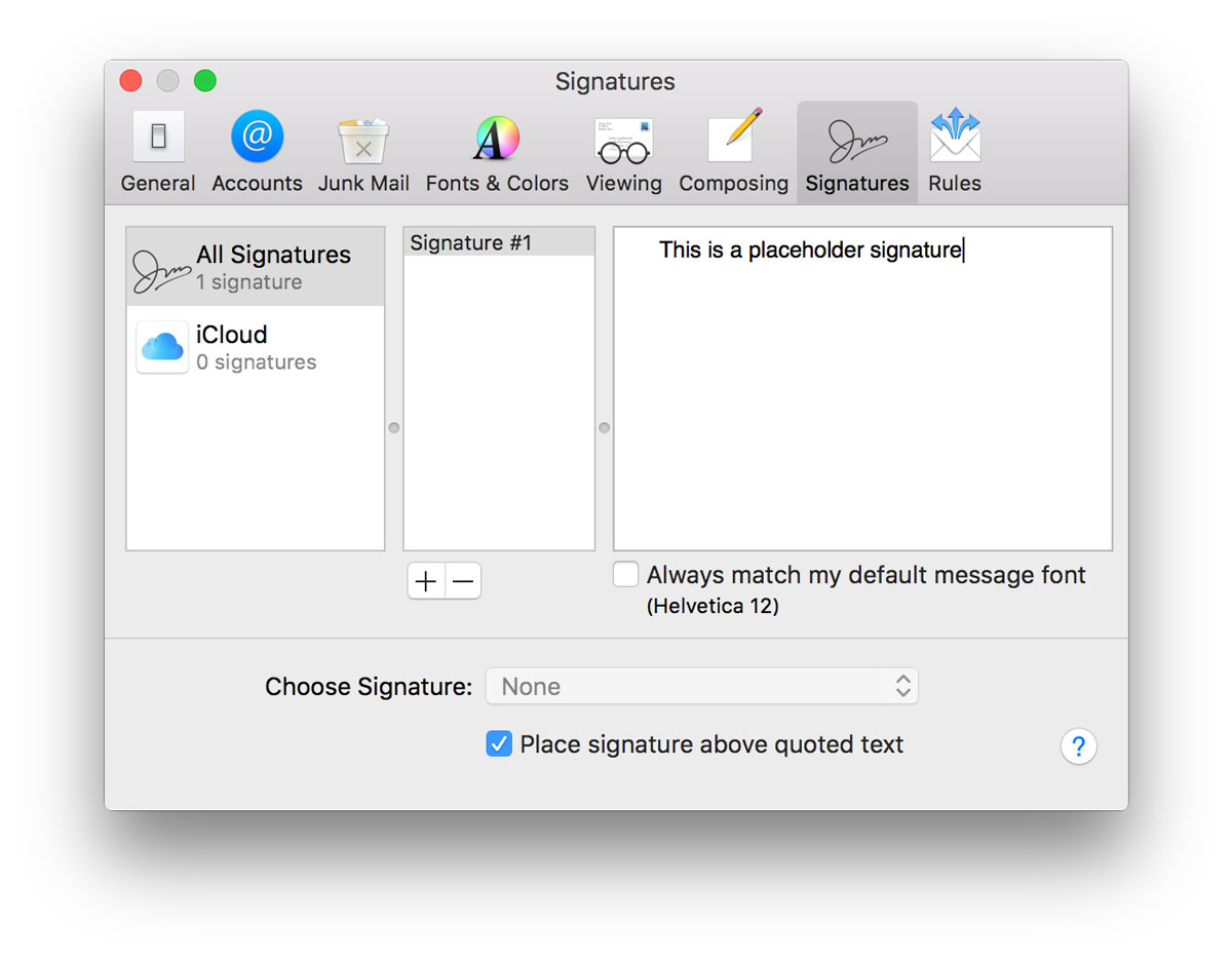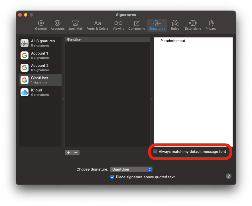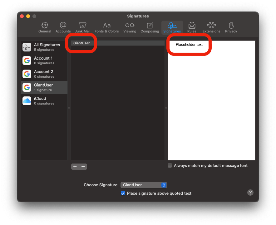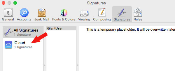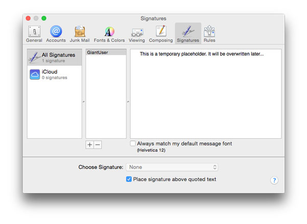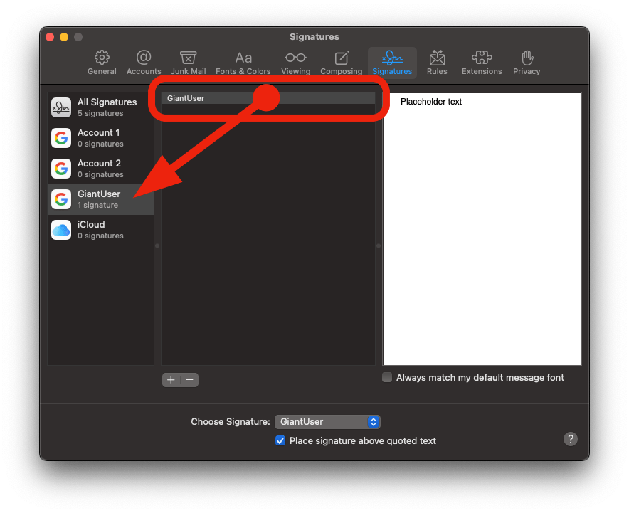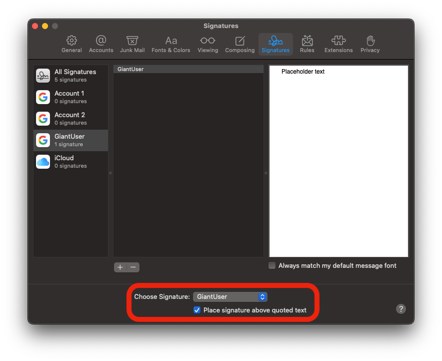 Associate the placeholder signature with one of your email accounts by dragging its name from the second column in the Preferences > Signatures window to an email account in the first column.