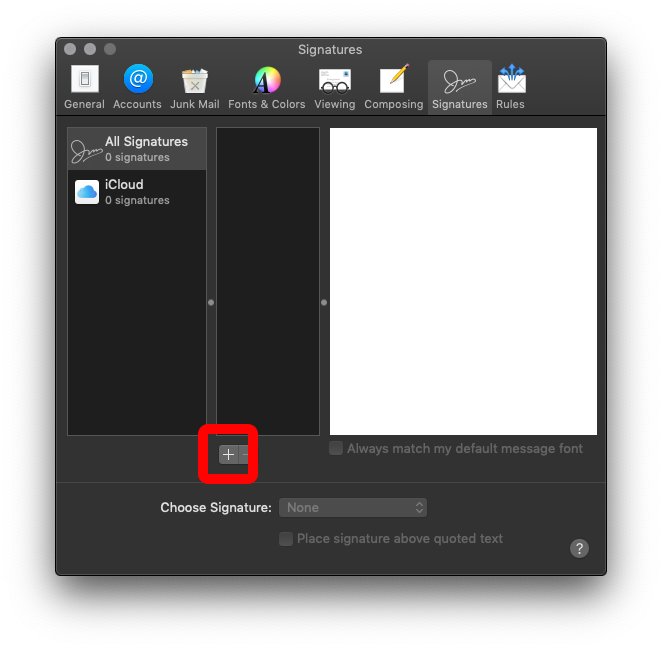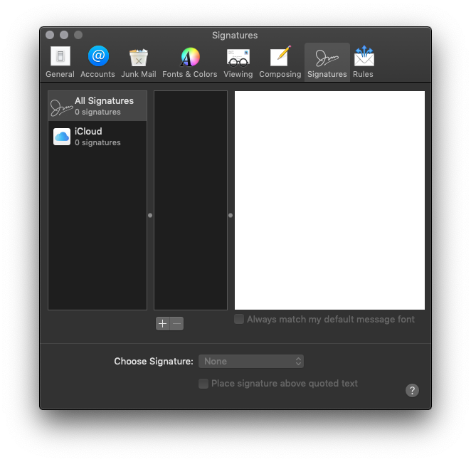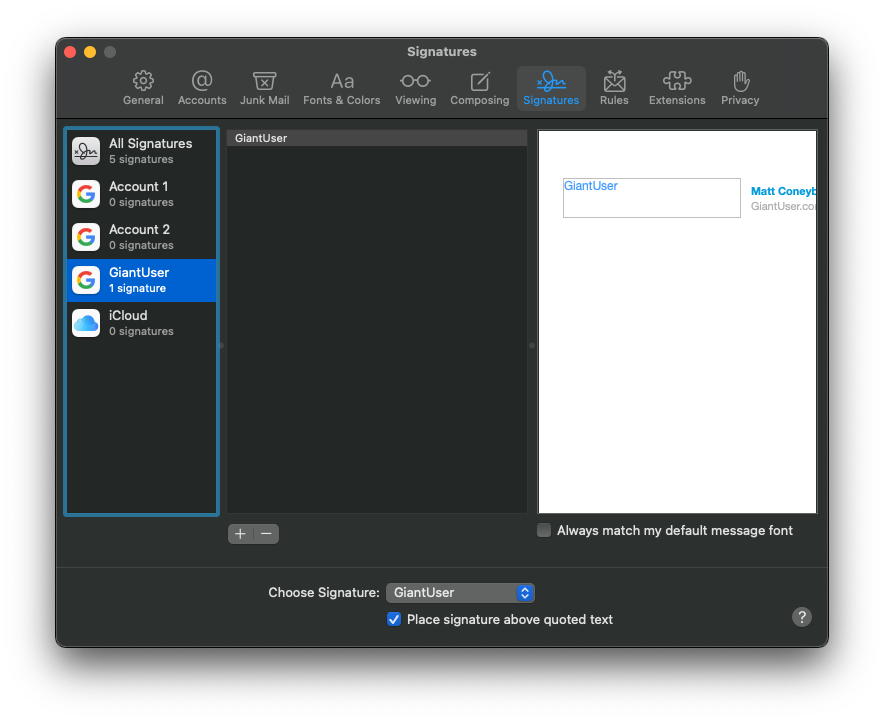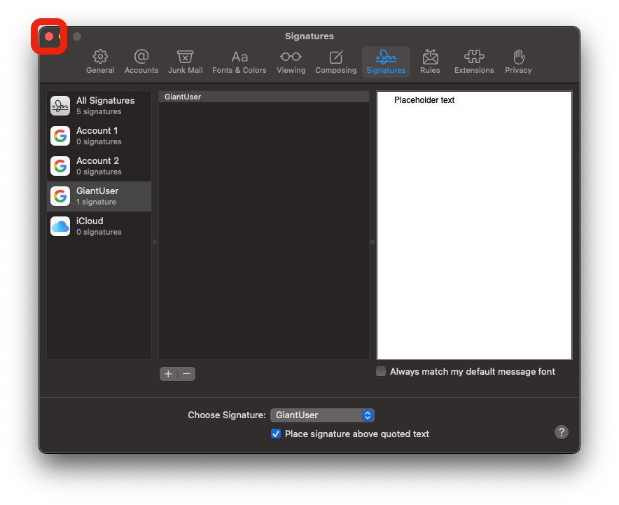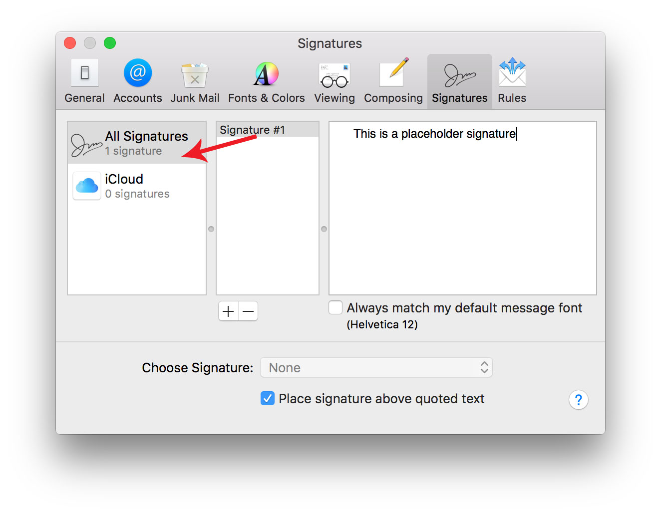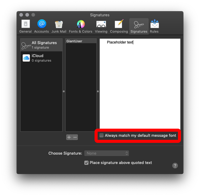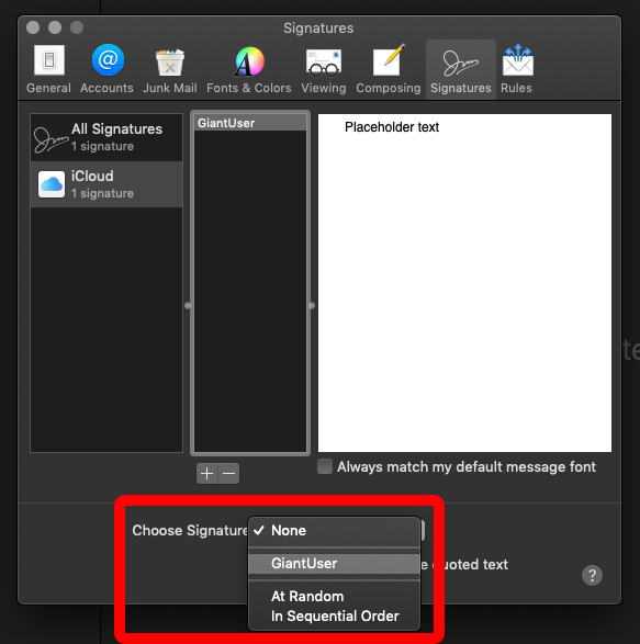 Associate the placeholder signature with one of your email accounts by dragging its name from the second column in the Preferences > Signatures window to an email account in the first column.