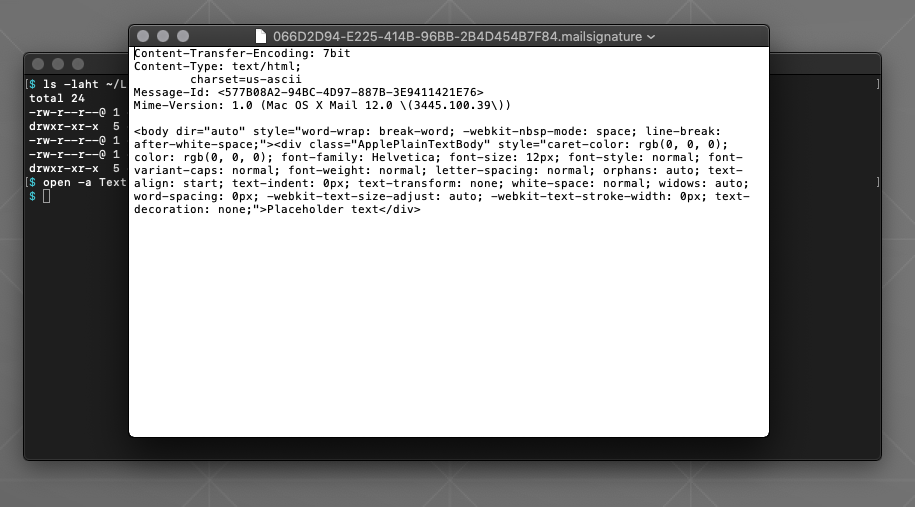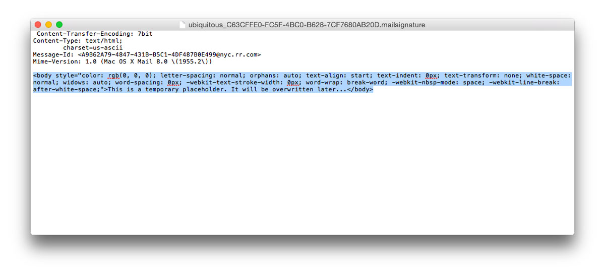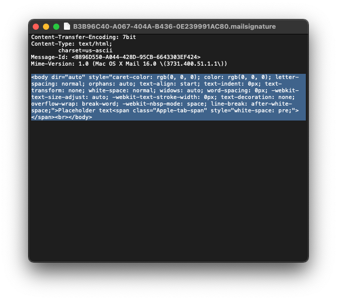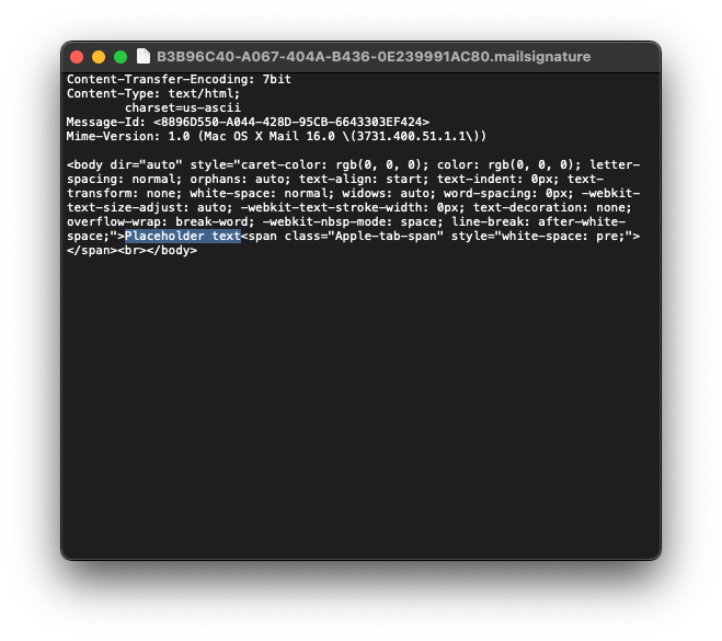 When you have located the right placeholder .mailsignature file, keep it open and close all other TextEdit windows.