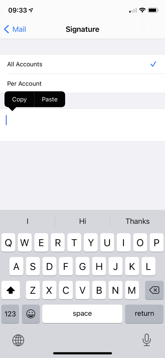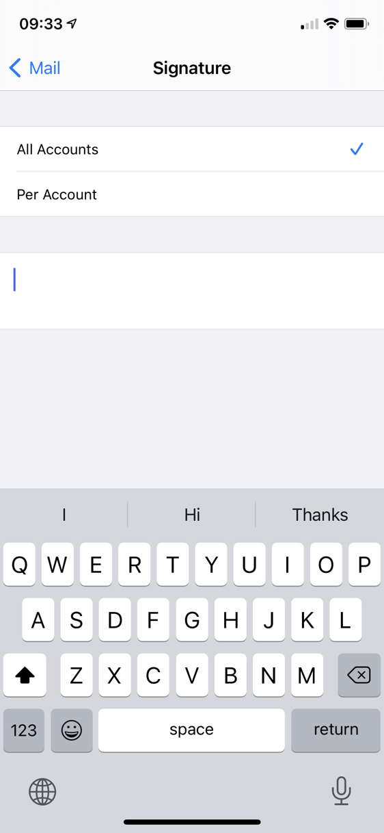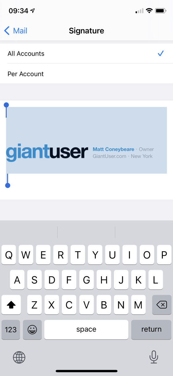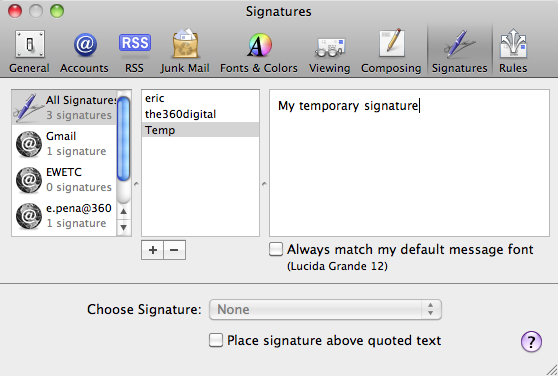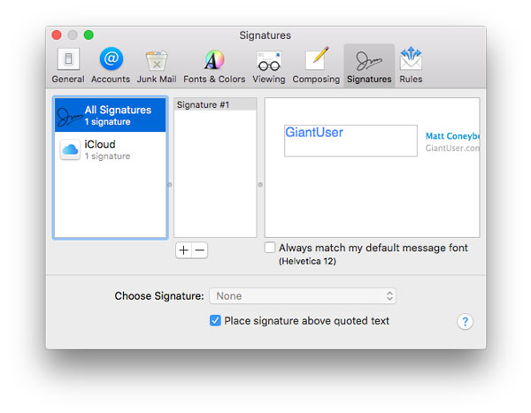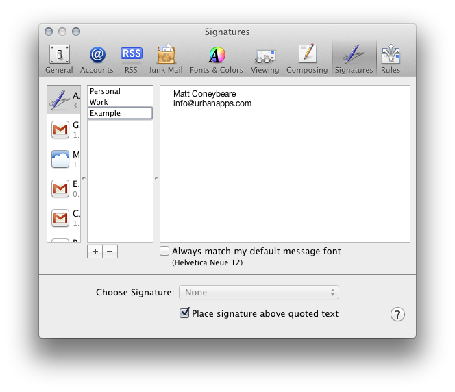 If you want to setup the signature to be the default for an email account with auto-load when starting a new message, select the email account in the first column, and choose the new signature.