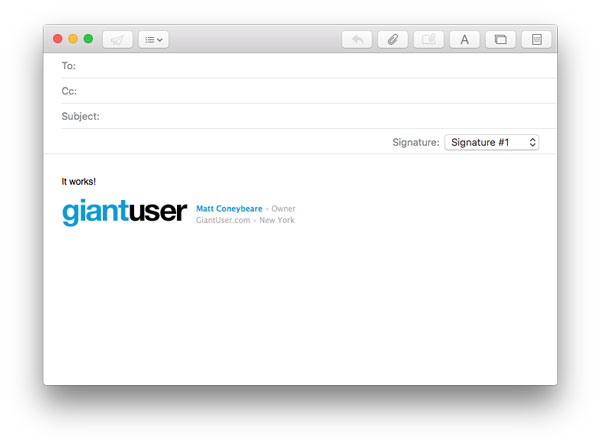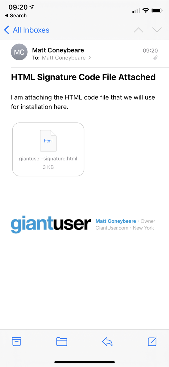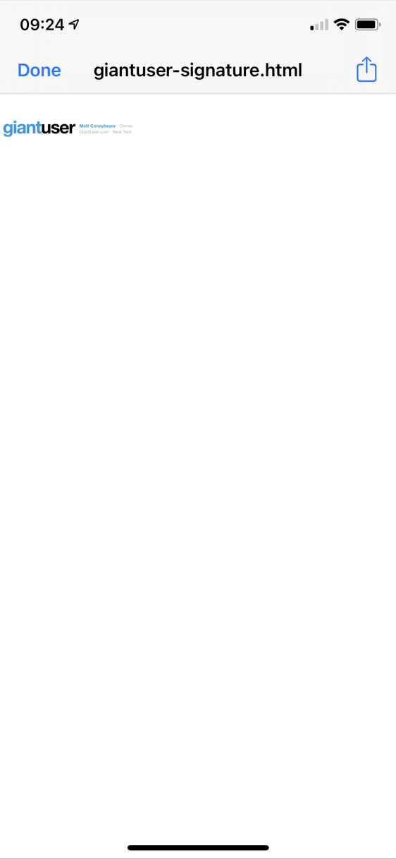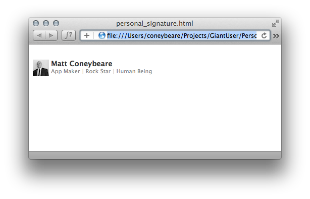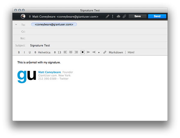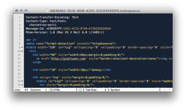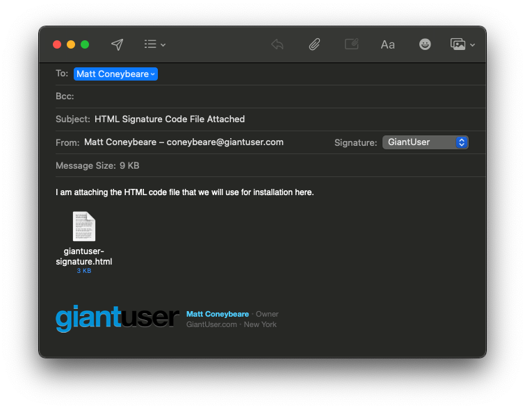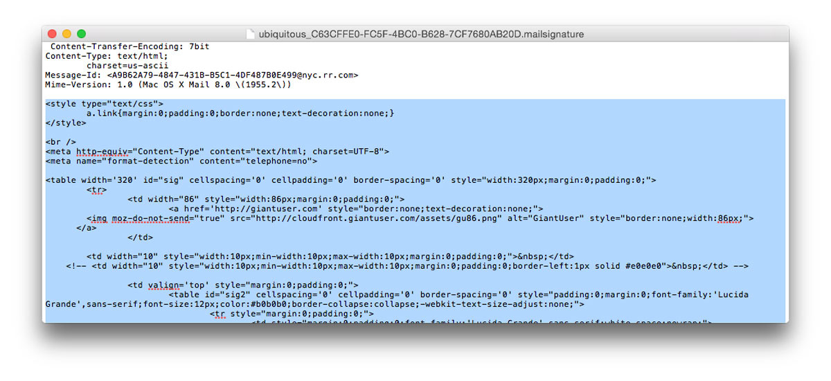 When your signature design and implementation is finished GiantUser will provide you with a packet containing the design files and most importantly, an HTML file containing the code. HTML is essentially a set of instructions that tell a web browser, or email program, how and what to display.