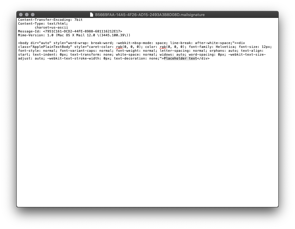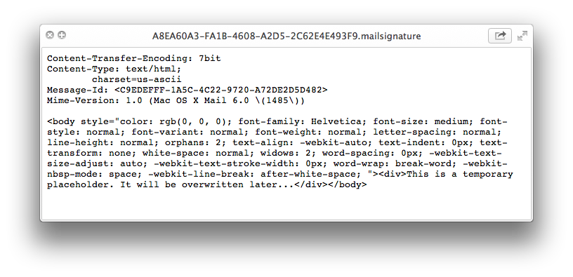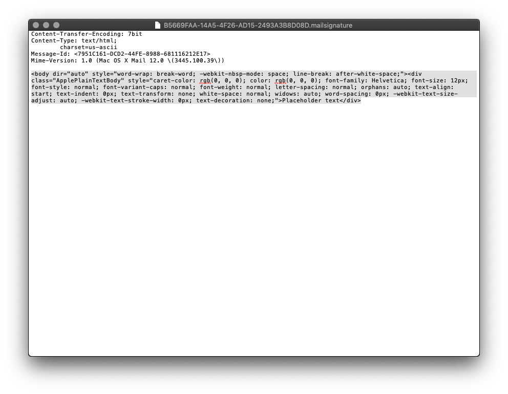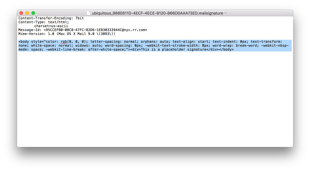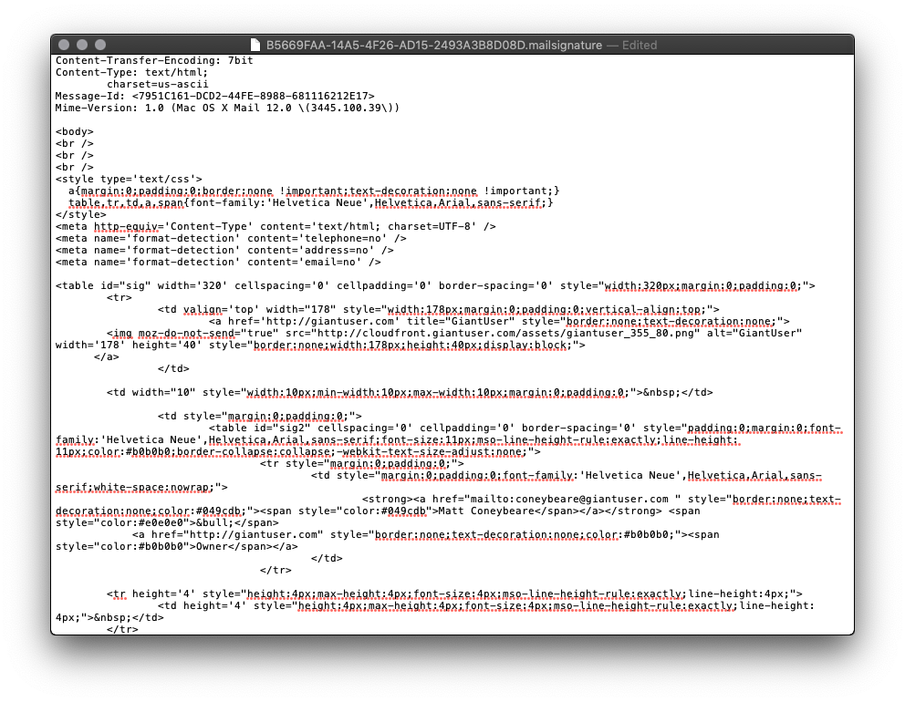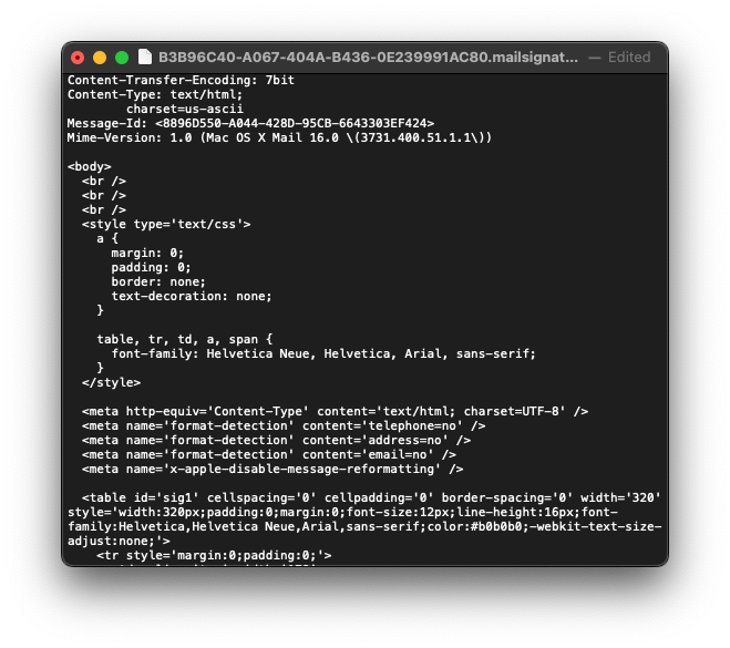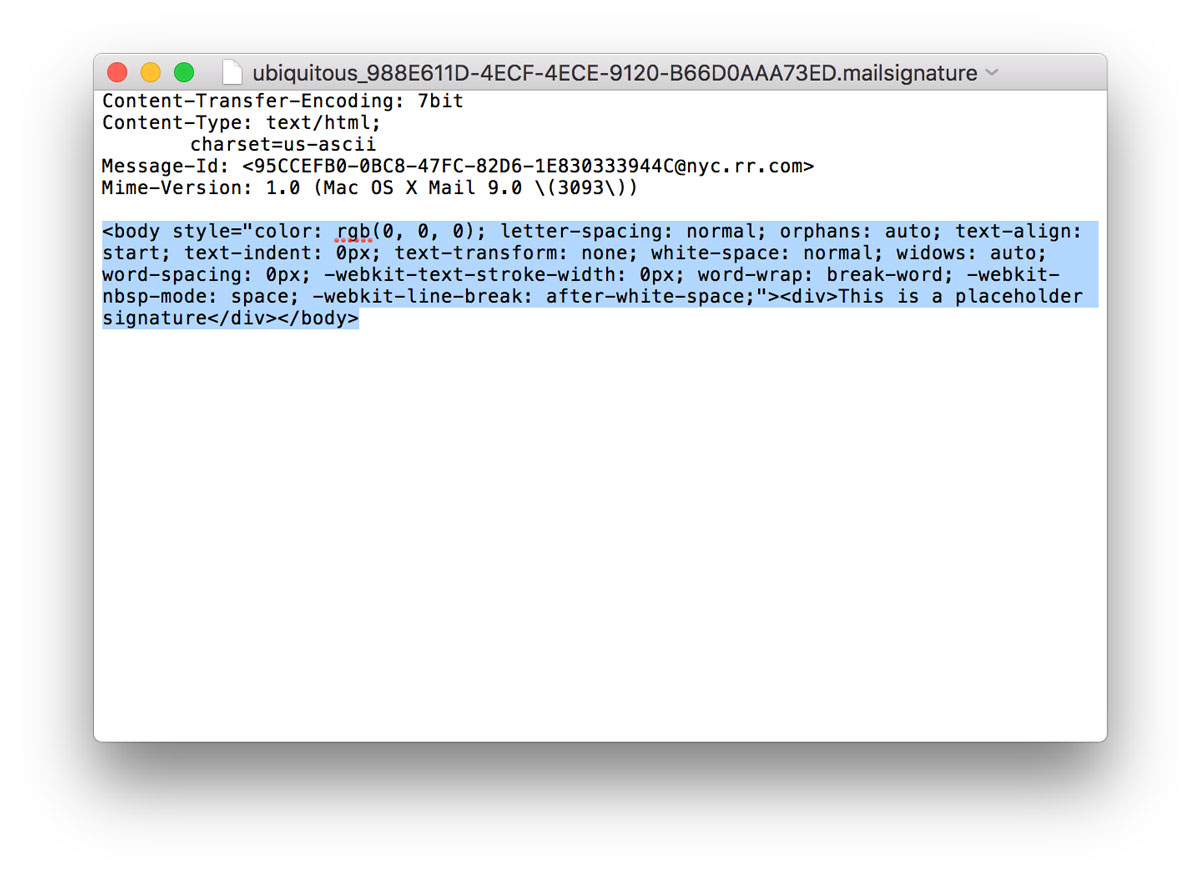 Now that you have the .mailsignature file(s) open in TextEdit, we need to ensure it is the right one.
