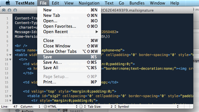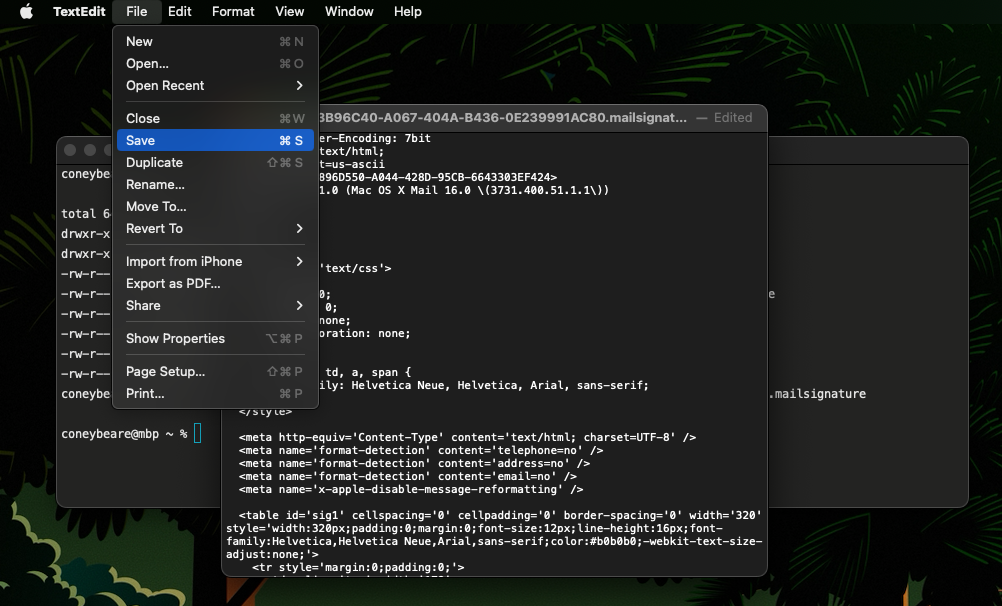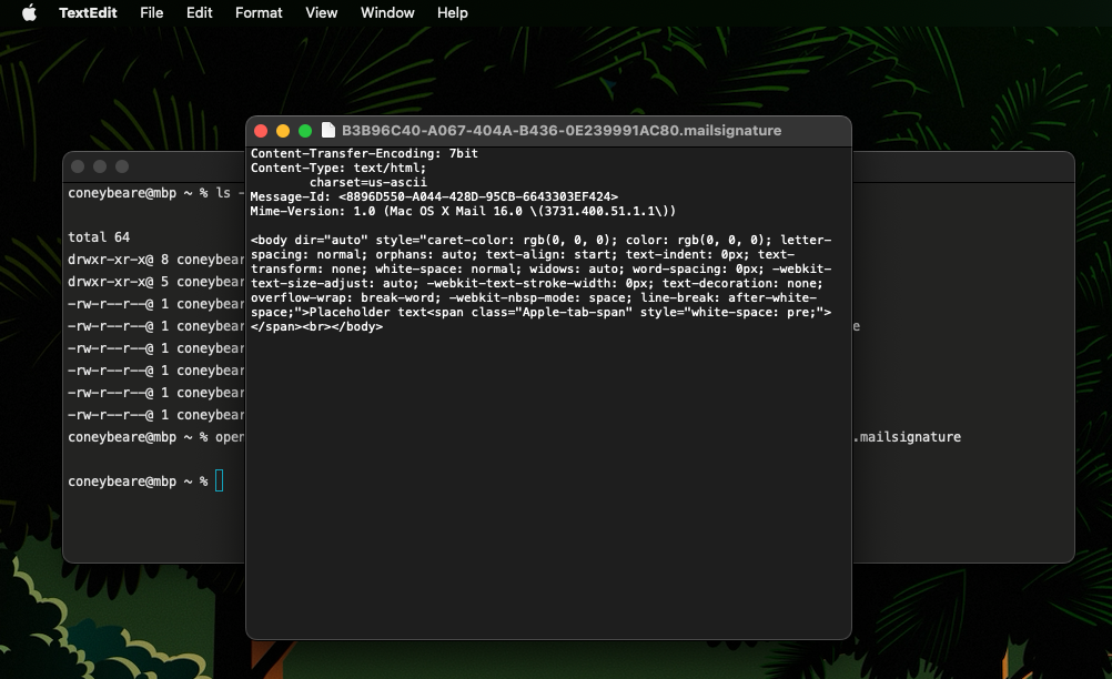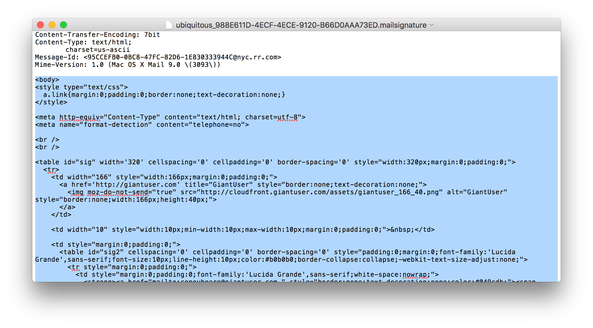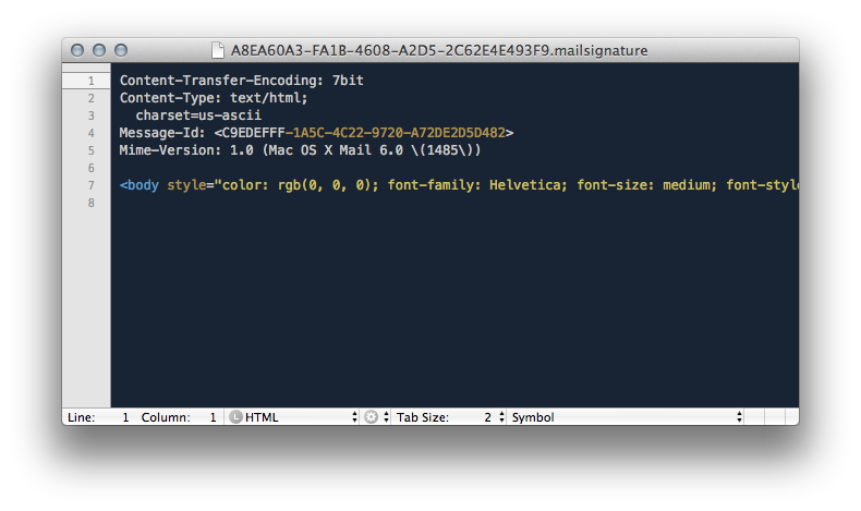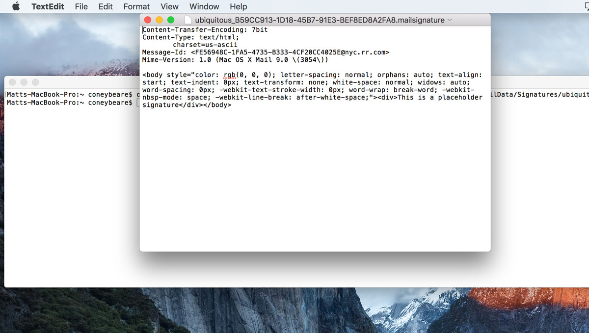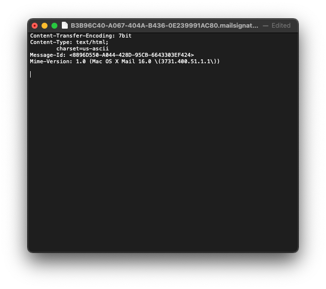 Now that you have the .mailsignature file(s) open in TextEdit, we need to ensure it is the right one.