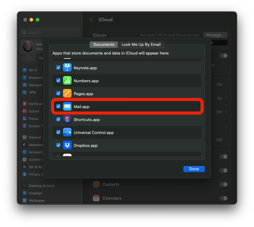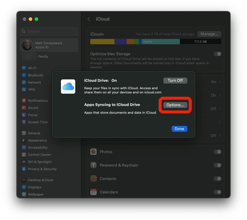 Double-check that iCloud Drive is enabled for Mail by clicking the Options button and ensuring the checkbox next to Mail is ticked.