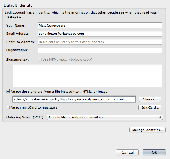 On the first panel that opens up, mark the checkbox beside "Attach the signature from a file instead (text, HTML, or image):". Click the "Choose" button and find the location of the HTML file you saved in step 1. Click OK to save the new signature settings for this account.